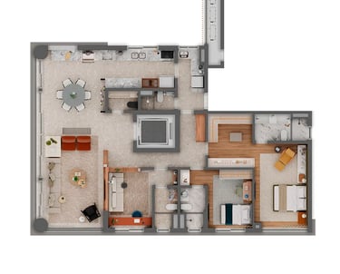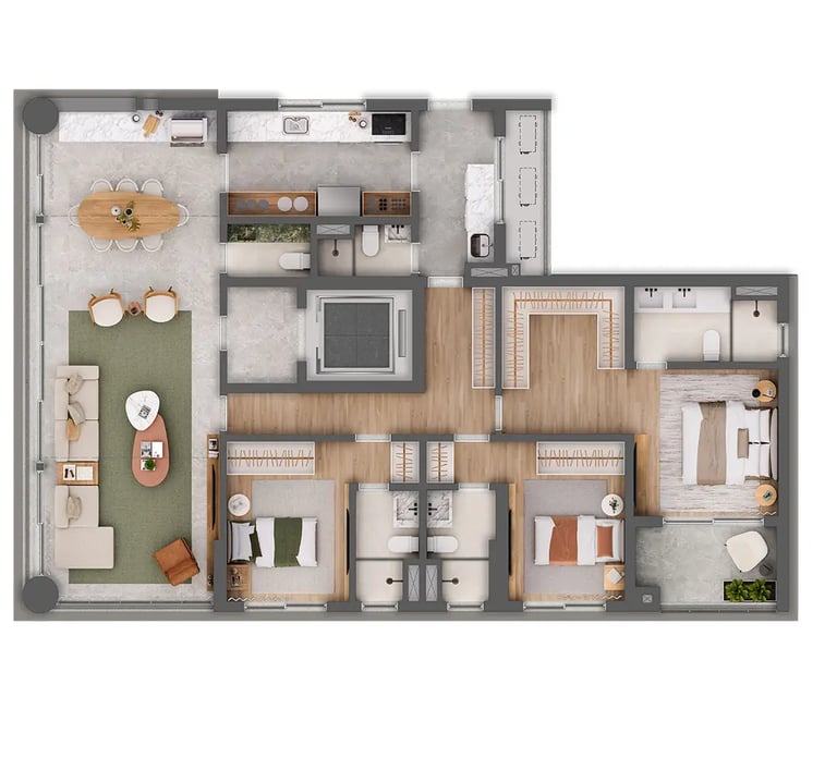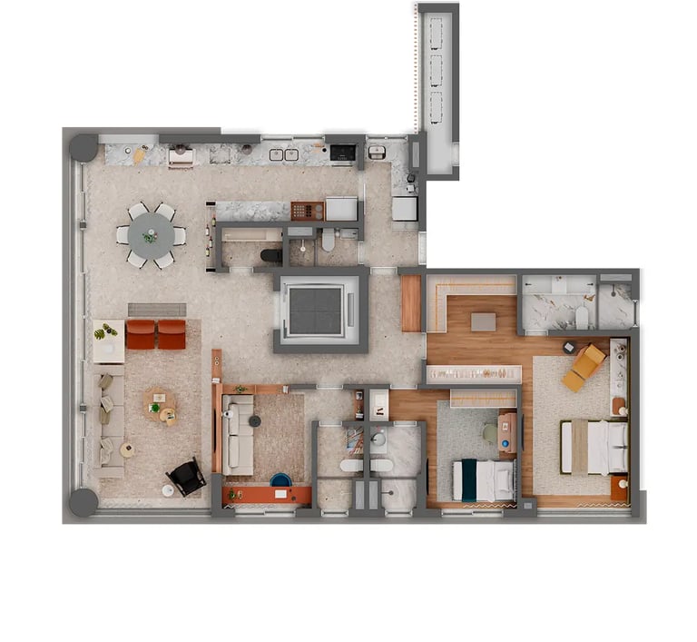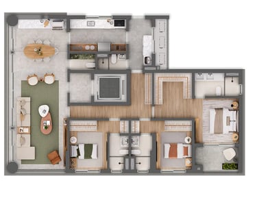 As plantas foram concebidas para promover a integração: salas ampliadas conectadas aos terraços e à cozinha criam espaços fluídos que potencializam o convívio e a interação.